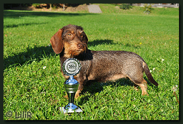 "Xantus-Fridolin von der Waldhöhe" hat sein Debüt nicht nur im Theater sondern auch auf der Zuchtschau erfolgreich gegeben. Am 08.07.2012 erlief er in Brachwitz unter den wachsamen Augen des Formwertrichters, Herr Jens Papenhagen, sein erstes "Vorzüglich" und wurde "Schönster Rauhhaar" der Zuchtschau. |