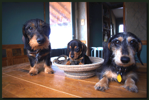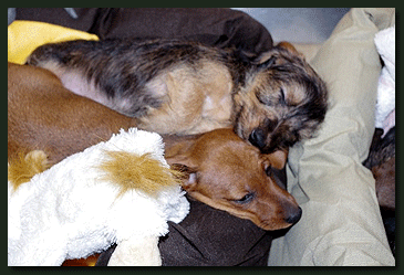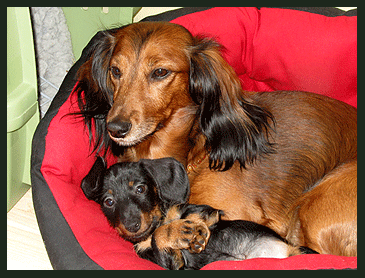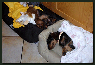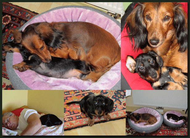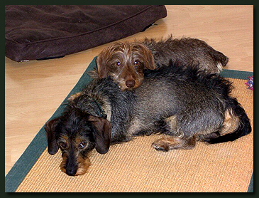 Die ersten Bilder von Käthe und Moritz aus ihrem neuen Zuhause in Windhoek, natürlich friedlich schlummernd und kein Wässerchen trübend, also ganz Teckel. Lulu, ebenfalls ein "Waldhöhe-Kind" zeigt den Zwei, wie man sich am besten einkuschelt. |