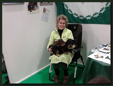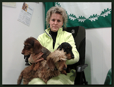 | Am Freitag, dem 27.01.2012 haben die "Waldhöher" auf der "Grünen Woche" in Berlin die Rasse Teckel unter Federführung des Verbandes für das Deutsche Hundewesen präsentiert. Seit vielen Jahren in Folge stellen sich die Rasseverteter den Fragen des interessierten Publikums. Hierzu gehört die Präsentation im Vorführring mit entsprechenden Erläuterungen zur Entwicklung und Verwendung der Rasse. Außerdem wurde zu einem späteren Zeitpunkt von mir an einem meiner Hunde erklärt, worauf bei der Fell- und Körperpflege eines Teckels zu achten ist. Die Popularität und Beliebtheit der Teckel hat bei den Besuchern keinen Abbruch genommen, ganz im Gegenteil, Dank ausführlicher Medienberichte war das Interesse und das Wissen um die Rasse gestiegen, so daß der Teckelstand immer dicht umlagert war. Die "Waldhöher" waren mit Vertretern der Rasse Kaninchenteckel vor Ort und dies in zwei Haararten, Rauhhaar und Kurzhaar. Seit einigen Monaten bereichert nämlich ein Kurzhaar-Kaninchenteckel Mädchen das kleine Rudel. Wir waren bemüht, ein breites Farbspektrum dem Besucher zu präsentieren, da den meisten Interessenten nur saufarbene Vertreter in "Normalgröße" geläufig waren. Somit kam natürlich immer wieder der Ausruf verbunden mit der Frage: "Ach wie niedlich, wie groß werden die denn, wenn sie erwachsen sind?". Das Erstaunen war groß, wenn gesagt wurde, daß bis auf einen 5 monatigen Welpen alle Hunde bereits das "Endmaß" erreich hätten. Als "Beratungsmuster" hatten wir somit im Rauhhaarbereich einen schwarz-roten, zwei braune und einen roten Teckel mit vor Ort. |