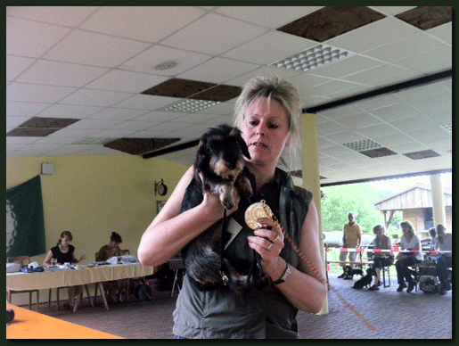 Am 22. 04. 2012 hatte mein Kurzhaar-Zwerg-Rüde "Karmel-Czuk Hodowla Myslinow" seinen ersten großen Aufritt im Ausstellungsring auf der Internationalen Ausstellung in Dresden. Hier erlief sich Karmel im Alter von 9 Monaten und 5 Tagen ein V1 mit allen Jugendanwartschaften. Ich bin sehr stolz auf meinen kleinen "Exoten". |