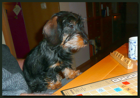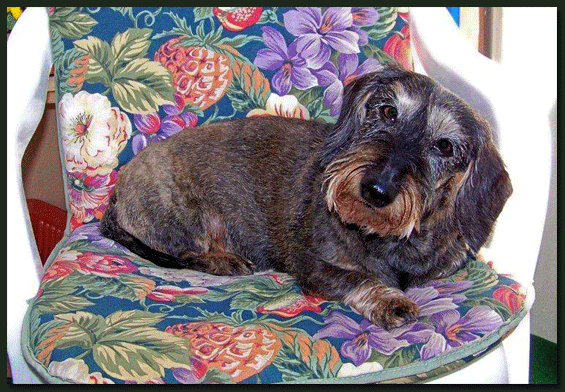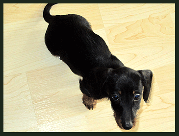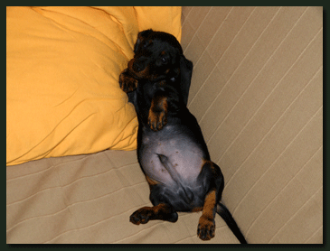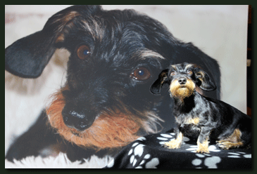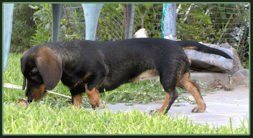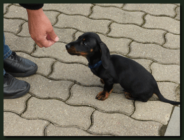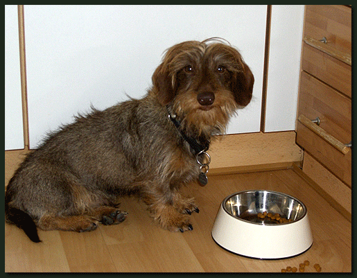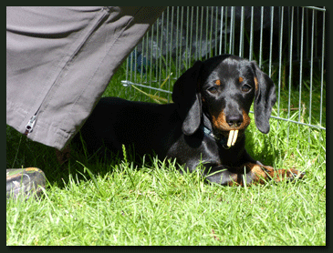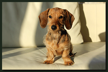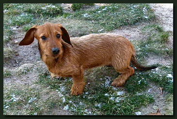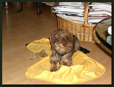 Heute erreichte uns ein neues Foto von Paulchen (Kurt von der Waldhöhe). Bei genauerem Betrachten drängt sich der Verdacht auf, daß Familie Köhler keinen Kaninchen-Teckel sondern einen Mini-Säbelzahntiger erworben hat, auch wenn dies vom Herrchen dementiert wird. |