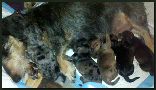 Heute erreichte uns die Nachricht, daß "Dr. House Junior" genannt Doc, Vater von 2,3 Welpen im Zwinger "Rising Ranch" geworden ist. Herzliche Glückwünsche nach Arizona an die Züchterin Veronica Quinn !!! In diesem Wurf liegen auch zwei Merle-Welpen, da die Hündin Muddy sowie Doc das Merle-Gen tragen. |