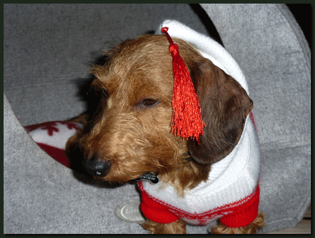 Die erste fotografische Rückmeldung von Higgens nach seinem Auszug. Gut verpackt trotzte er auf Sylt Wind und Wellen und fühlte sich wohl wie ein Fels in der Brandung. Da so ein Hundeleben aber nicht nur aus Spass besteht, hat seine Familie zu Hause gleich mal Ernst gemacht und einen "Dackel-Benimm-Kurs" mit Minizweibeiner gebucht ... |