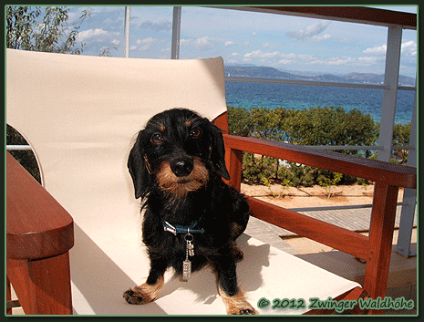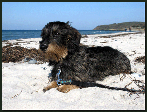 Sonnige Urlaubsgrüße von der Ostseeinsel Hiddensee sendete uns Lumpi mit bürgerlichem Namen "Irwisch von der Waldhöhe". Lumpi findet es an der Ostsee toll, aber er hätte sie gern ohne Wellen, die sind ihm irgendwie unheimlich. |