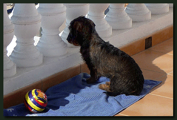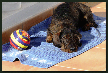 Sonnige Grüße aus Morro Jable sendet "Oberst Oskar von der Waldhöhe" ins kühle Deutschland. Oskar kann sich gar nicht so richtig auf seinen FC Barcelona Ball konzentrieren, weil auf der Promenade unter ihm eine niedliche Hündin ihre Reize spielen läßt. |